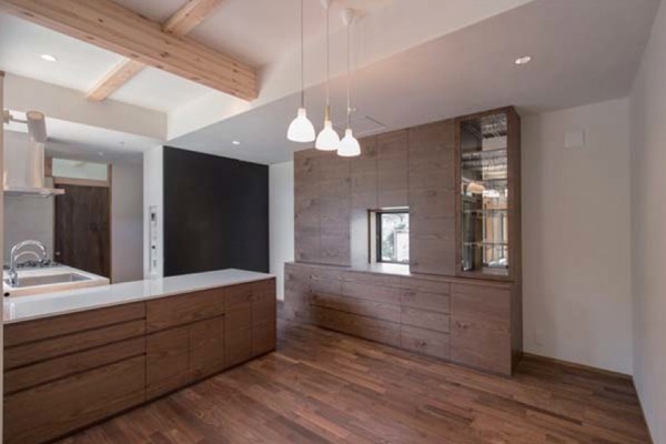 重厚感あるウォールナットのフローリングに合わせ、キッチンの扉にもウォールナットを使用。長いキャビネットに合わせ、木目もきれいに繋がっております。 -